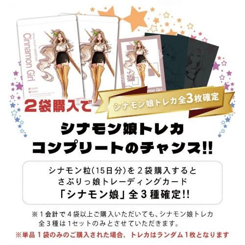 ※誕生日イベント限定のシナモン娘のコンプリートカード(3枚セット)は、「シナモン粒 約15日分」を2袋以上購入した場合のみ付属いたします。 1袋のみ購入の場合はトレカは1枚のみの付属になりますので予めご了承ください。
